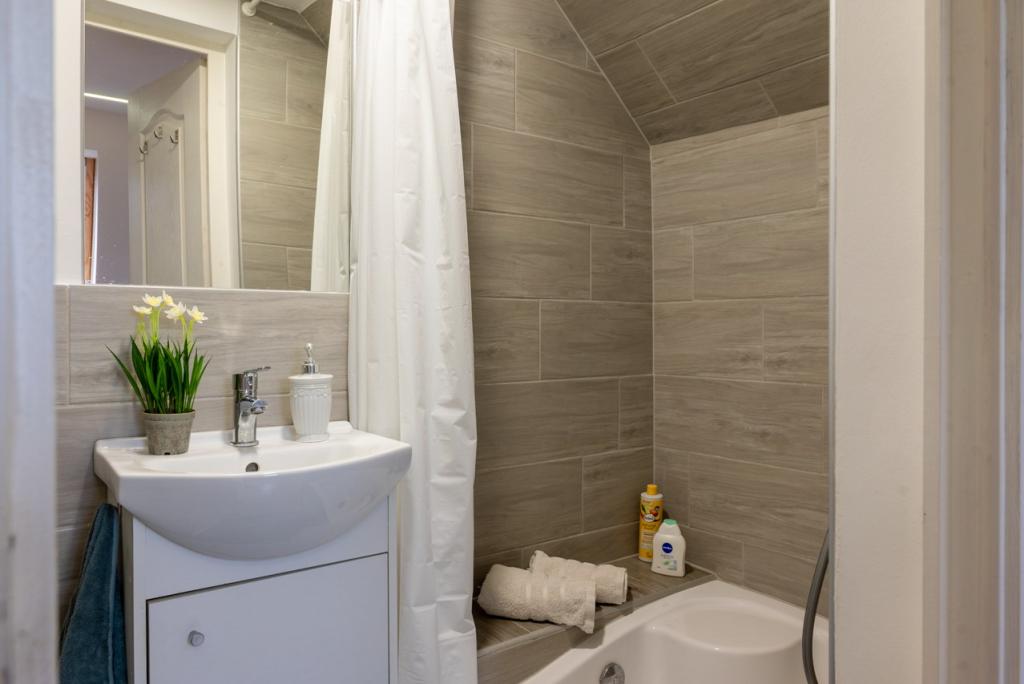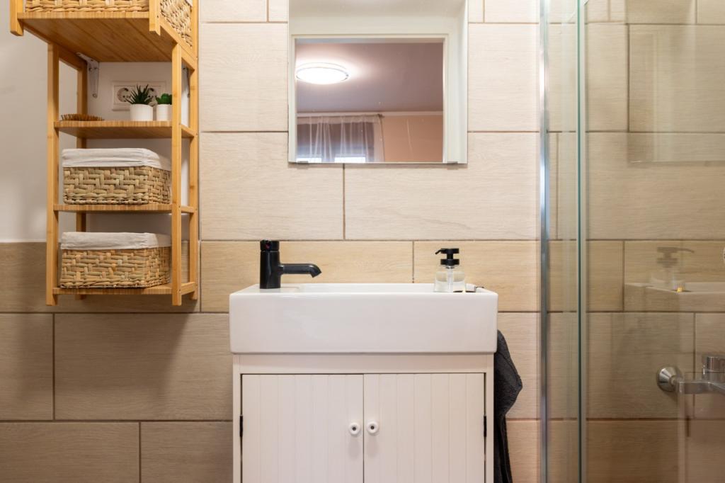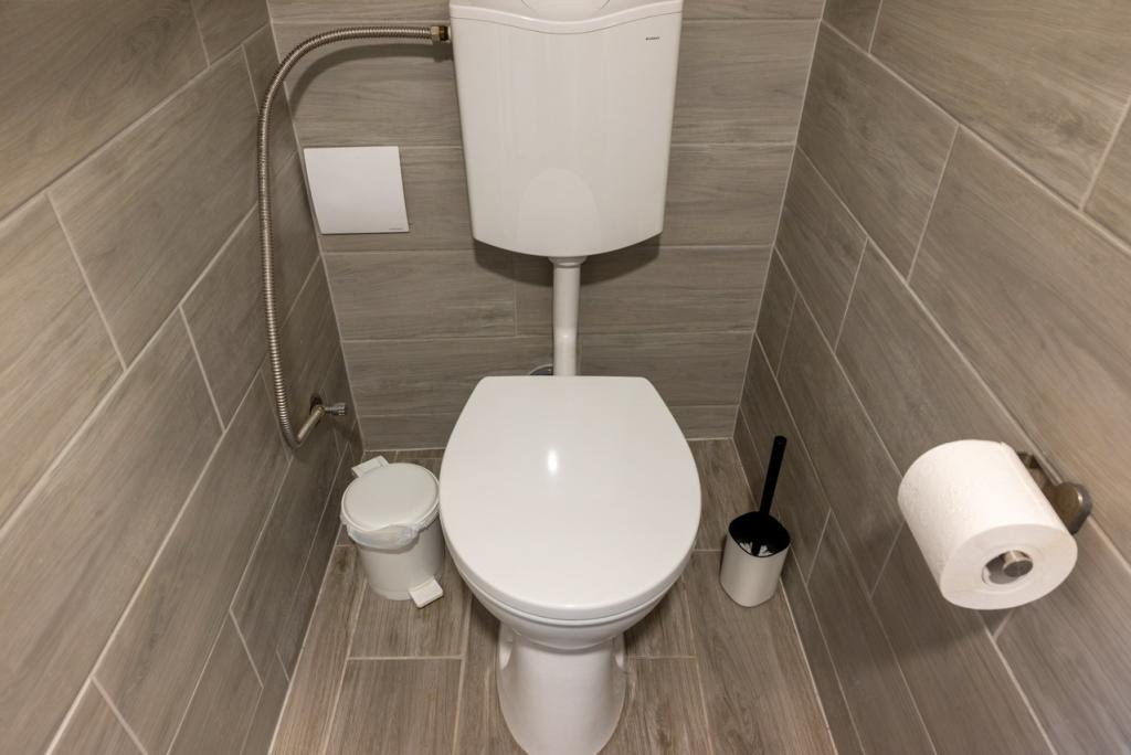 A földszinten helyezkedik el az egyik zuhanyzós fürdőszoba, WC-vel.