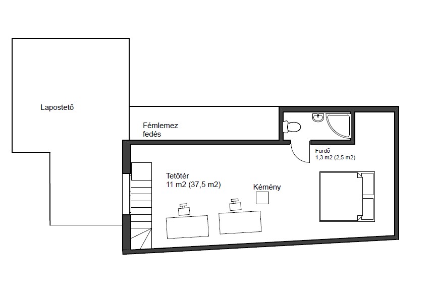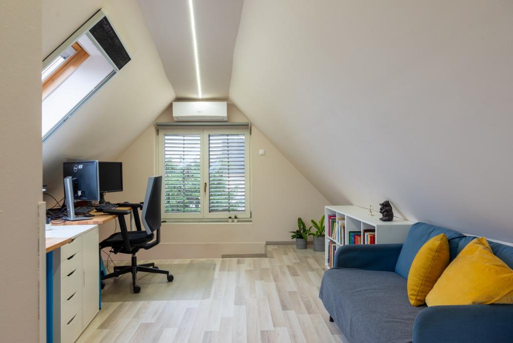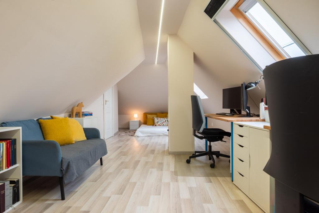 A tetőtérben kialakított tágas, egyterű (bruttó 35 nm) helyiség számos lehetőséget kínál, igény esetén könnyen leválasztható egy újabb szoba. Jelenleg irodaként használják, de lehet gyerekszoba vagy vendégszoba kinek mire van szüksége. Itt kapott helyet a második fürdőszoba is WC-vel.