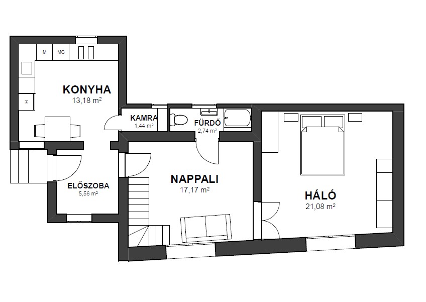 A földszinten található egy ideális méretű előszoba, kellemes, világos nappali (17 nm-es) és innen nyílik a hálószoba (21 nm-es), ahol kipihenheti a mindennapok fáradalmait, mindkettő utcára néző és K-i fekvésű.