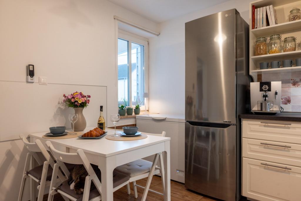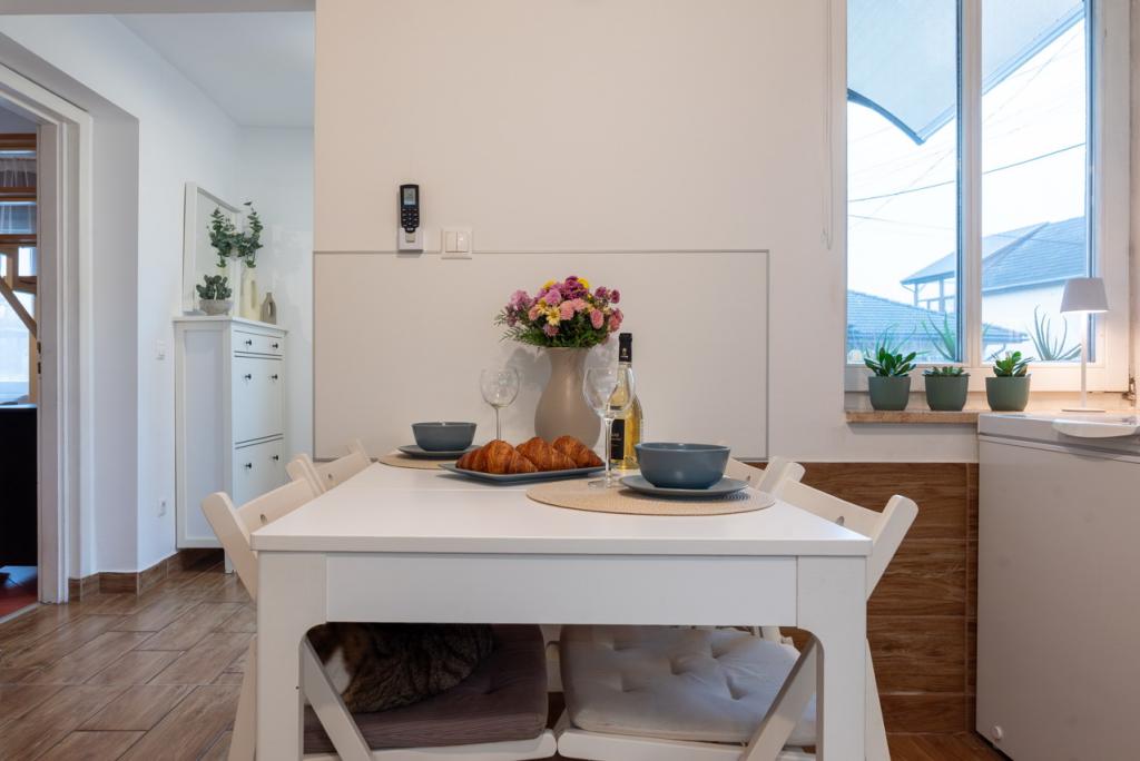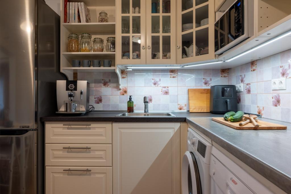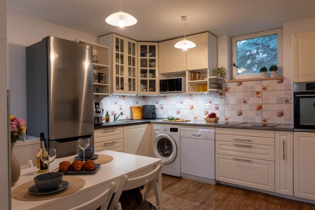 A külön konyha van, beépített modern bútorokkal gépekkel felszerelt, melyek a vételár részei, nagy udvarra néző ablakkal, itt a főzés nemcsak szükséglet, hanem élmény is lehet. A konyhából nyílik a kincset érő kamra igazi áldás minden gondos háziasszony számára, polcokkal, melyek mindent elnyelnek a lekvároktól a befőttekig.