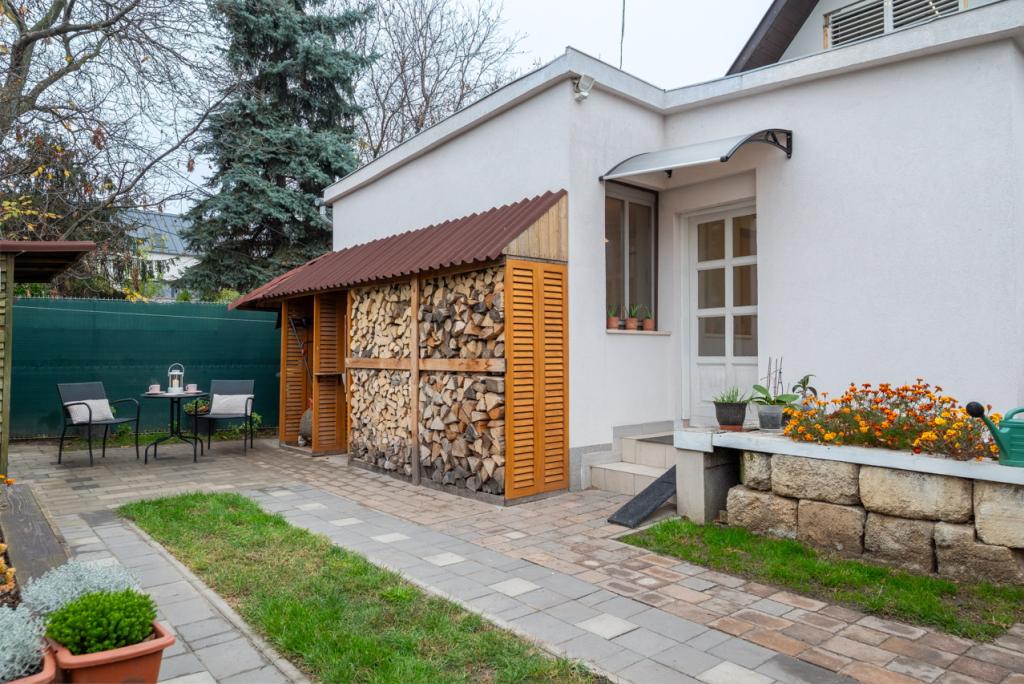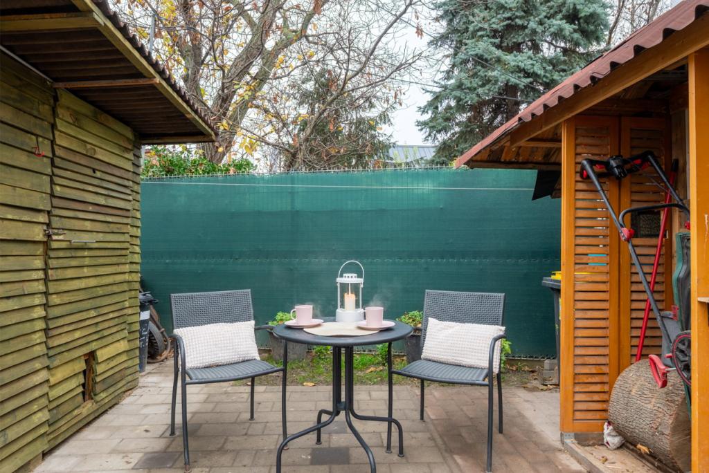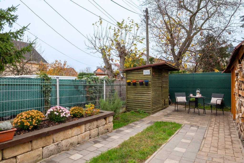 Van egy kicsi kb.50 m2-es kert, ami lehetőséget ad akár két kocsival a beállásra, vagy kertipartyk tartására. Valóban nem nagy a kert, de itt is kellemes időt lehet eltölteni. Két esővízgyűjtő és komposztáló is szolgálja a környezet tudatosságot. Az udvarban található még, fatároló, 2 db magas ágyás és egy kerti tároló.