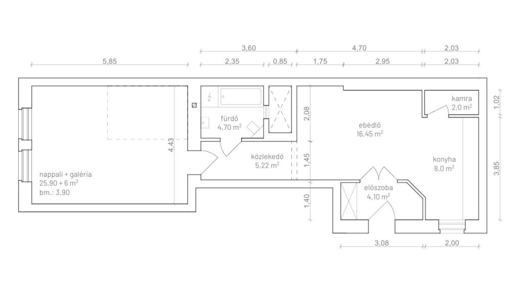 A lakás 2015-ben esett át egy felújításon, azóta átlagosjó állapotban van. A déli fekvésű utcai szoba galériával bővített, világos tér, amelyben a magas belmagasság és a polgári arányok otthonos hangulatot varázsolnak.