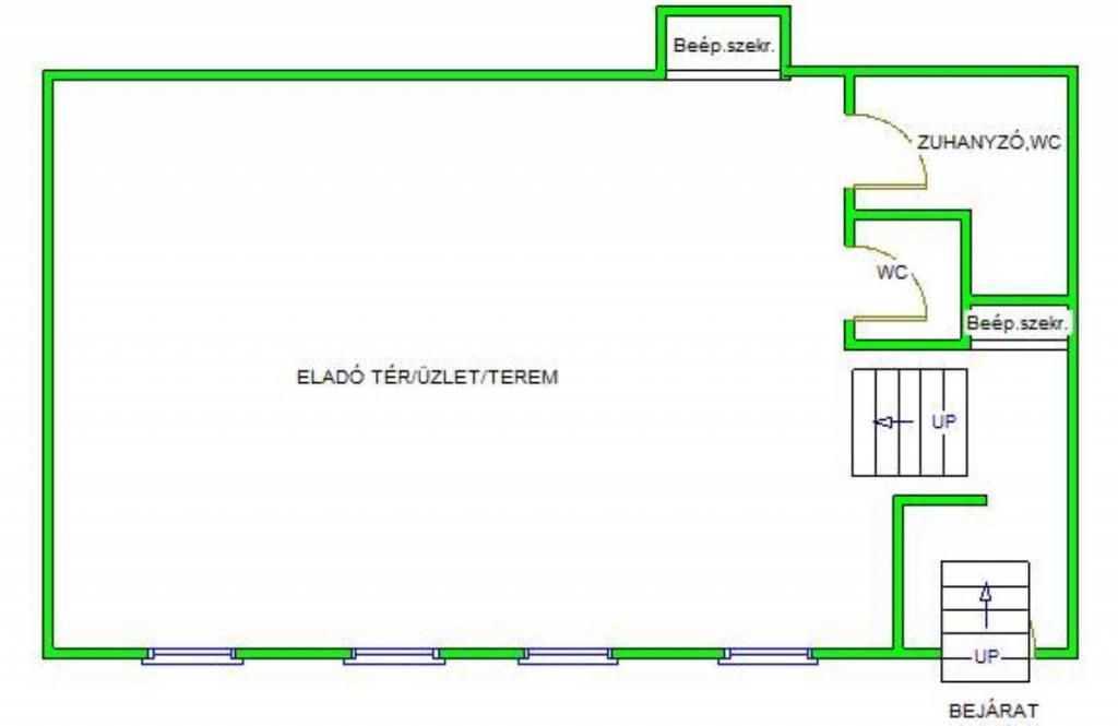 Jelenleg egy kb.75 nm-es egy légterű helyiséggel, egy zuhanyzós fürdőszobával, WC-vel rendelkezik, de külön is van egy vendég WC.