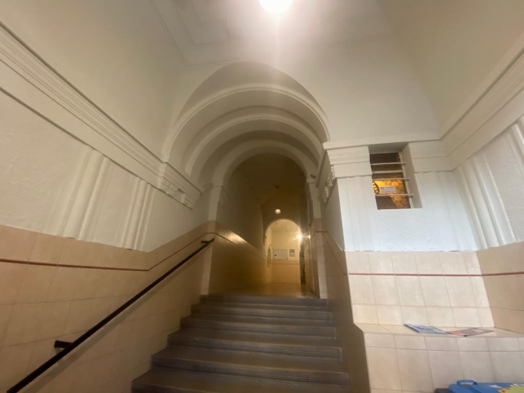 The building is historically significant: built in 1913 in Art Nouveau style, it has 5 floors and an elevator. The elegance of the staircase is enhanced by original nameplates, glass windows, and an ornate brass-decorated gate.