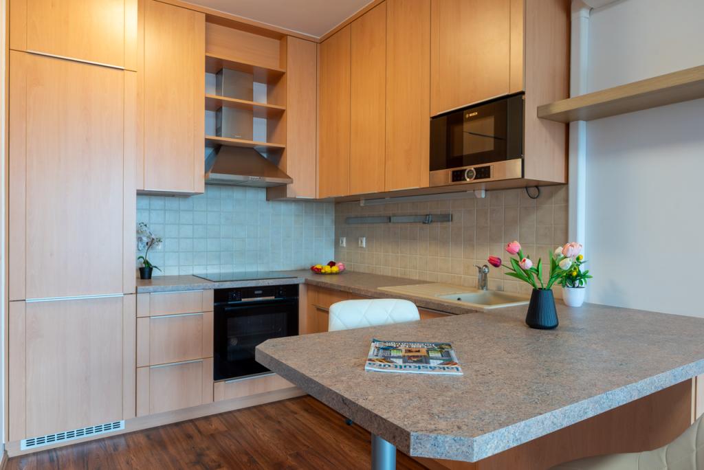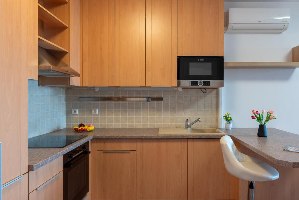 A modern, gépesített konyha prémium minőségű Bosch készülékekkel felszerelt (beépített hűtő, fagyasztó, mosó-szárítógép). Praktikus külön kamra van. A beépített szekrények és polcrendszerek rengeteg tárolási lehetőséget kínálnak.