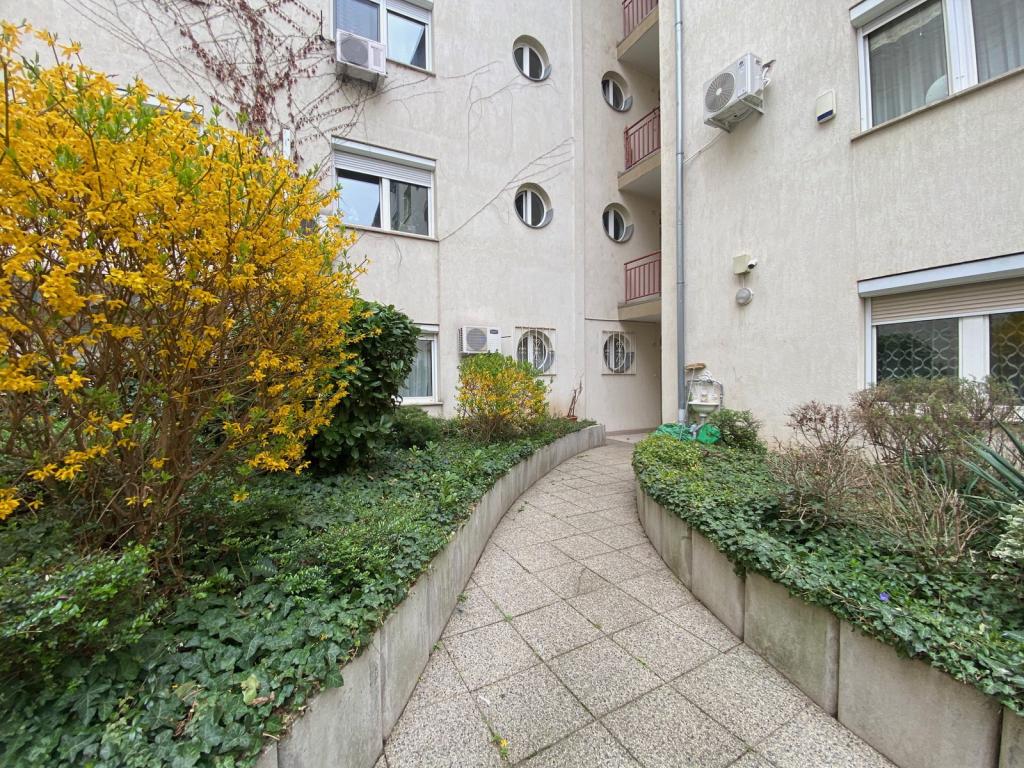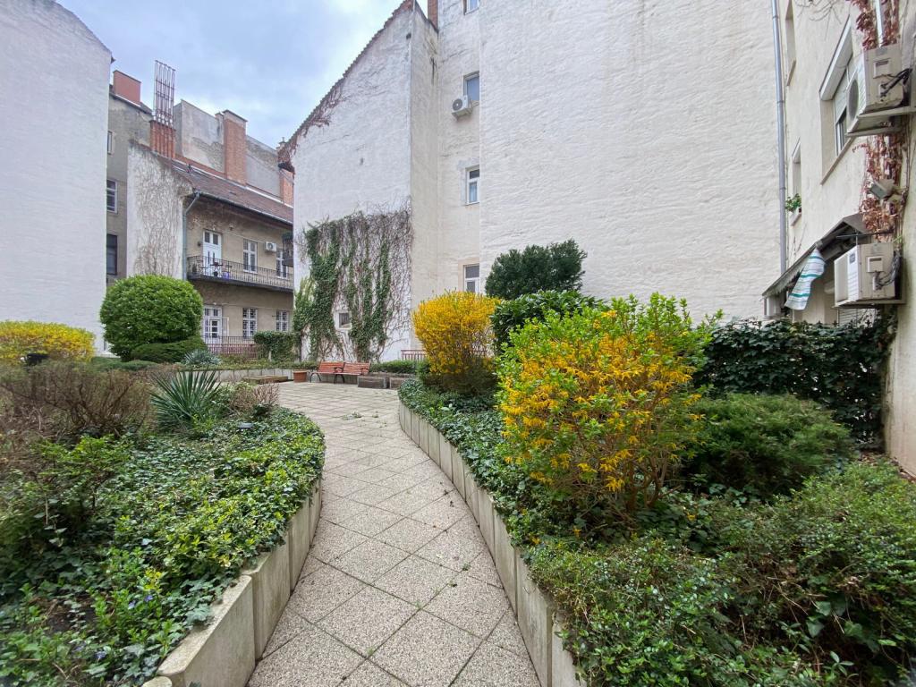 A bútorozott, gépesített, légkondis kis lakás magas földszinti és a ház saját gyönyörűen parkosított, gondozott belső kertjére néz.