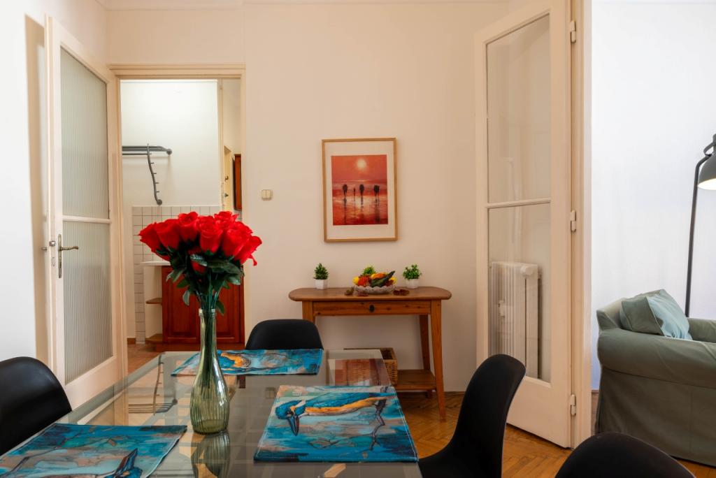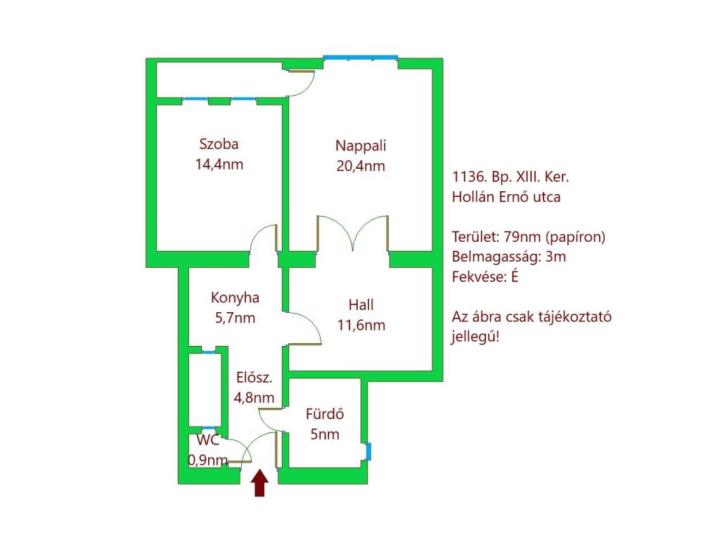 A lakás az 5. emeleten található, 65 m2 alapterületű, 2 szoba + tágas hall elrendezésű, utcai kilátással és erkéllyel. A szobák külön bejáratúak, így a lakás praktikus és kényelmes.