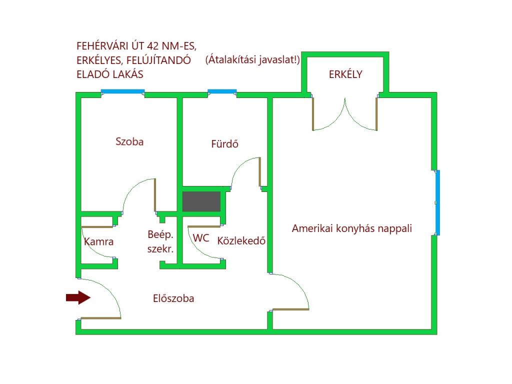 A lakás praktikus elrendezésű, minden négyzetmétere jól kihasználható, ugyanakkor a felújítás során kiválóan alakítható: könnyedén kialakítható amerikai konyhás nappali + külön hálószoba, így modern, élhető otthon hozható létre. Az erkély zöldre néz, nyugodt pihenést biztosít a városi környezetben.